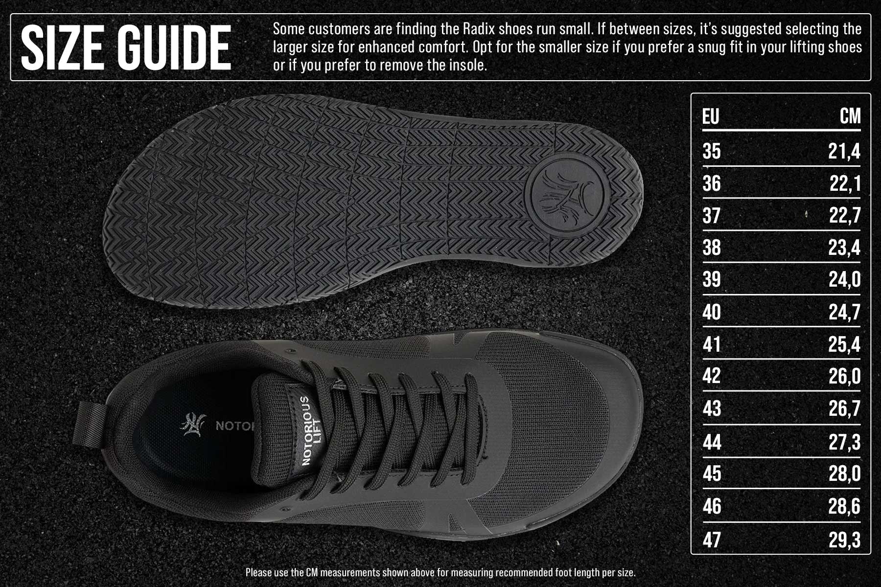 Some customers are finding the Radix shoes run small. If between sizes, it’s suggested selecting the larger size for enhanced comfort. Opt for the smaller size if you prefer a snug fit in your lifting shoes or if you prefer to remove the insole.