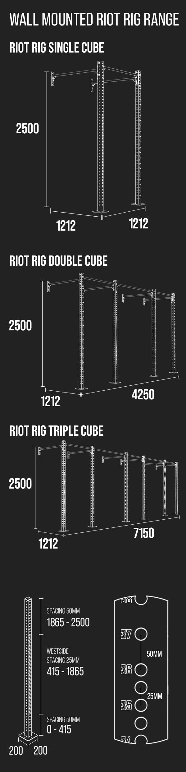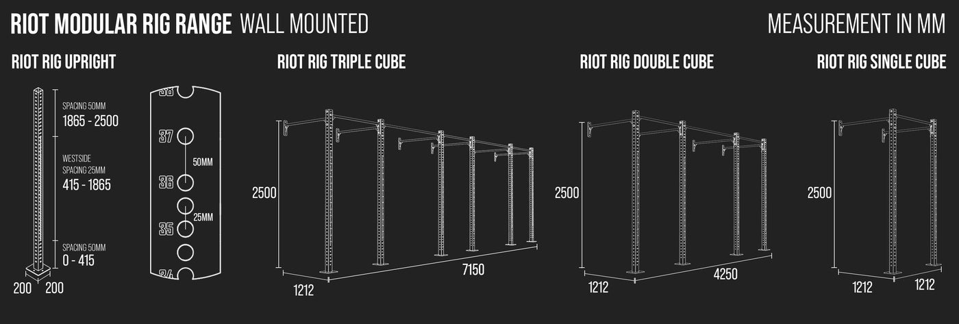The ultimate wall-mounted rig for large gyms, CrossFit boxes, and high-performance training spaces. With a 7m width, the Riot Rig Wall Mounted Triple Cube allows multiple users to train at once, without taking up unnecessary floor space. Built with ultra-durable 75x75mm steel, it’s ideal for Olympic lifting, strength training, and functional workouts. Includes Westside hole spacing for optimal height adjustments.